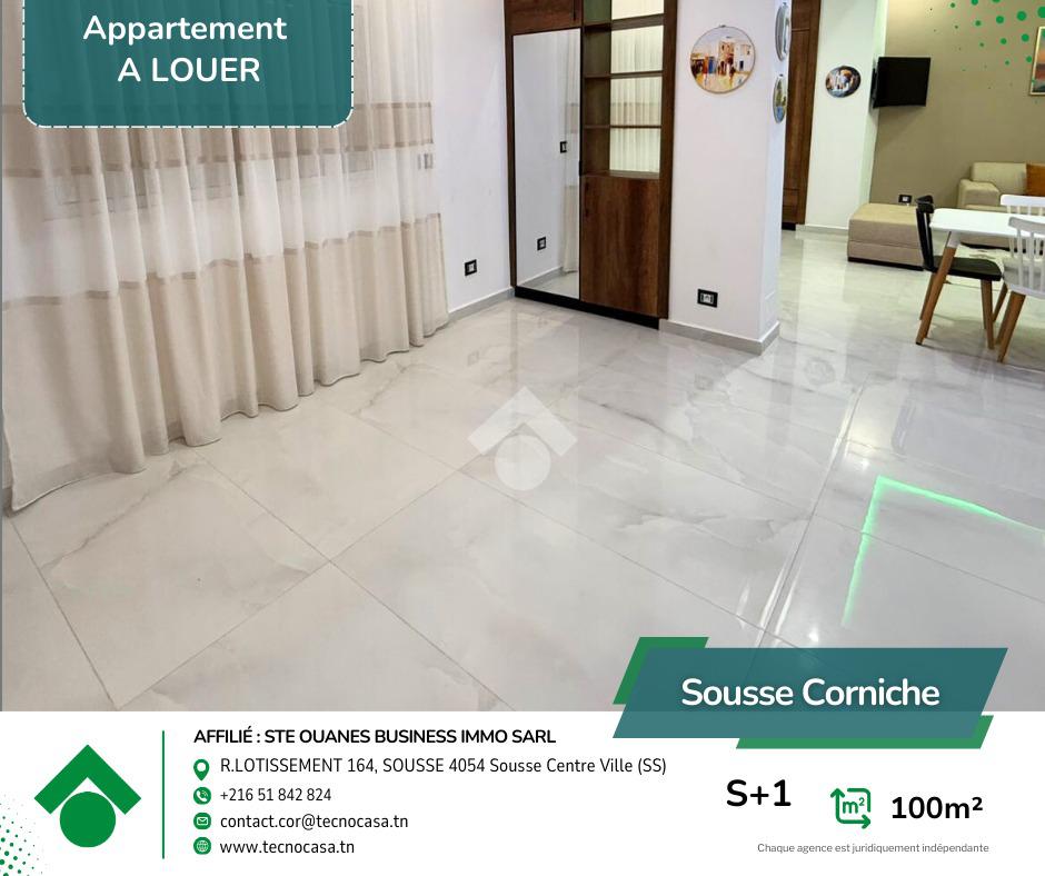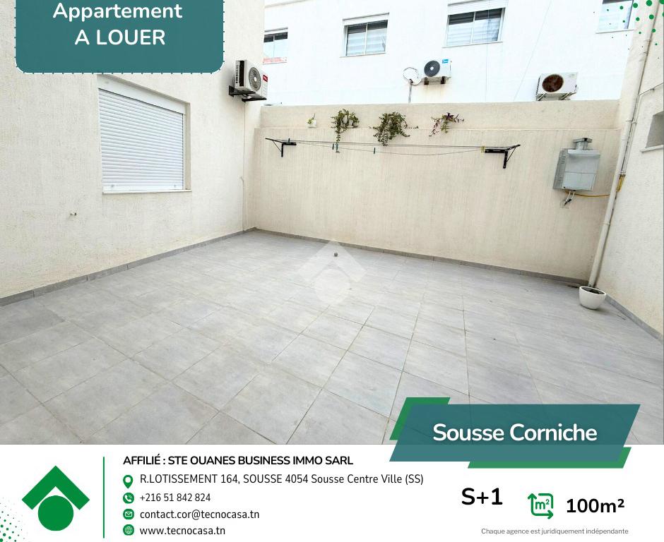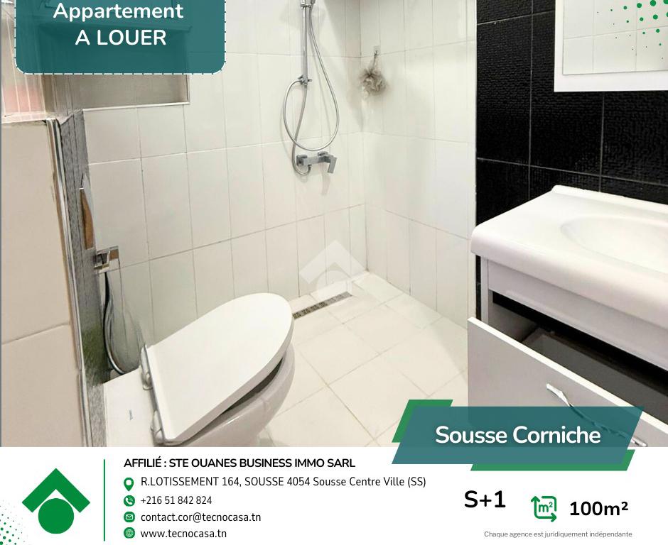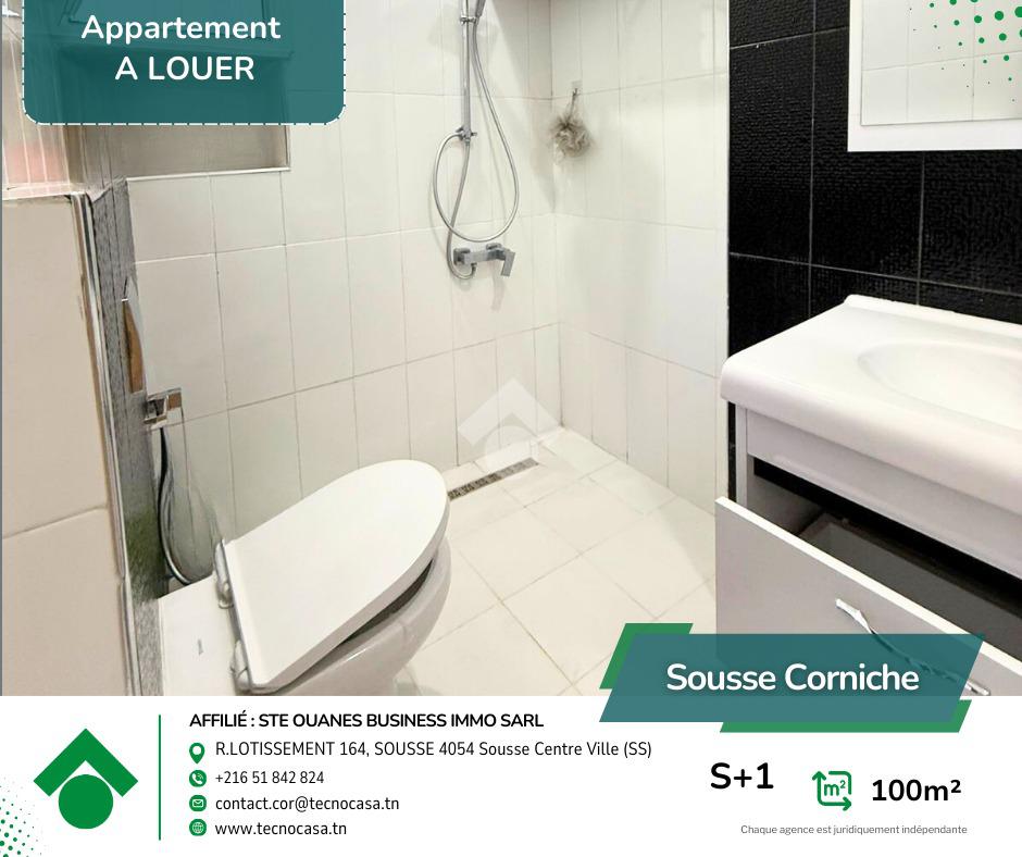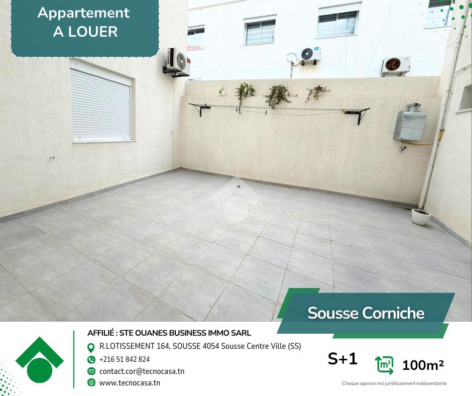 Idéalement situé à la Corniche, dans une zone de villas, cet appartement S+1, jamais habité, se trouve au rez-de-chaussée d’une résidence calme.