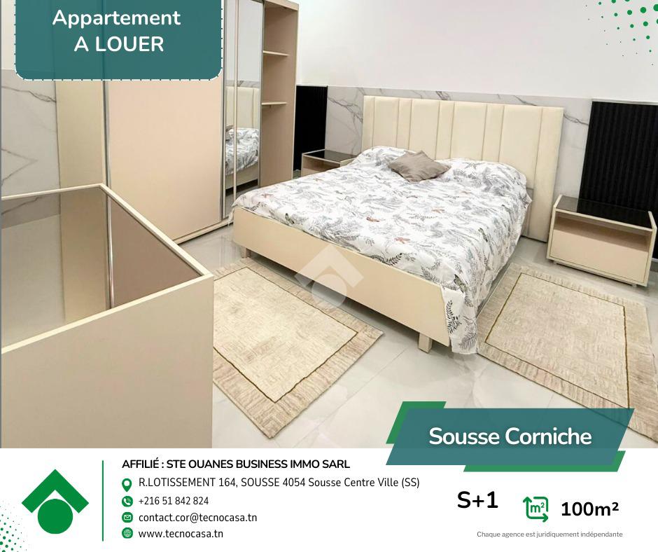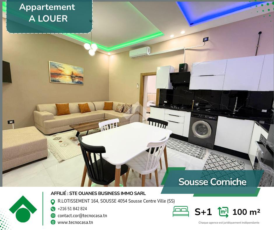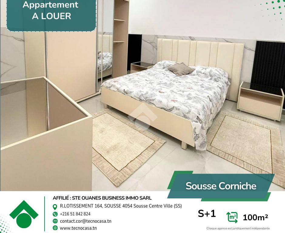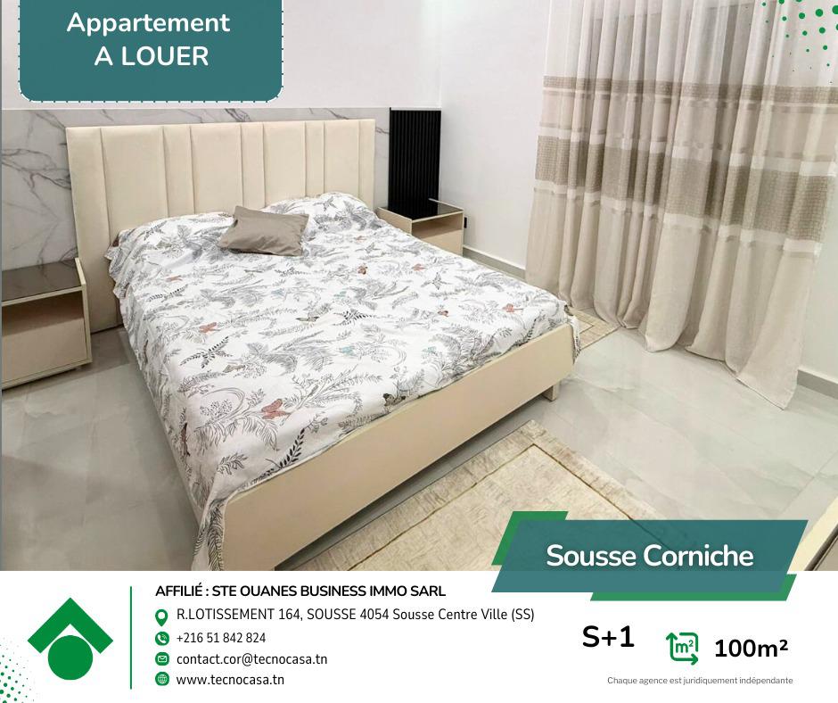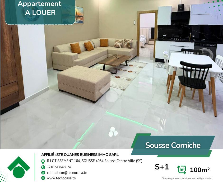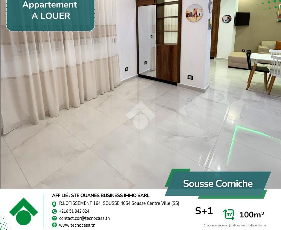 Idéalement situé à la Corniche, dans une zone de villas, cet appartement S+1, jamais habité, se trouve au rez-de-chaussée d’une résidence calme.