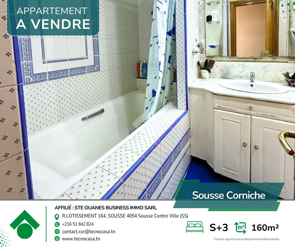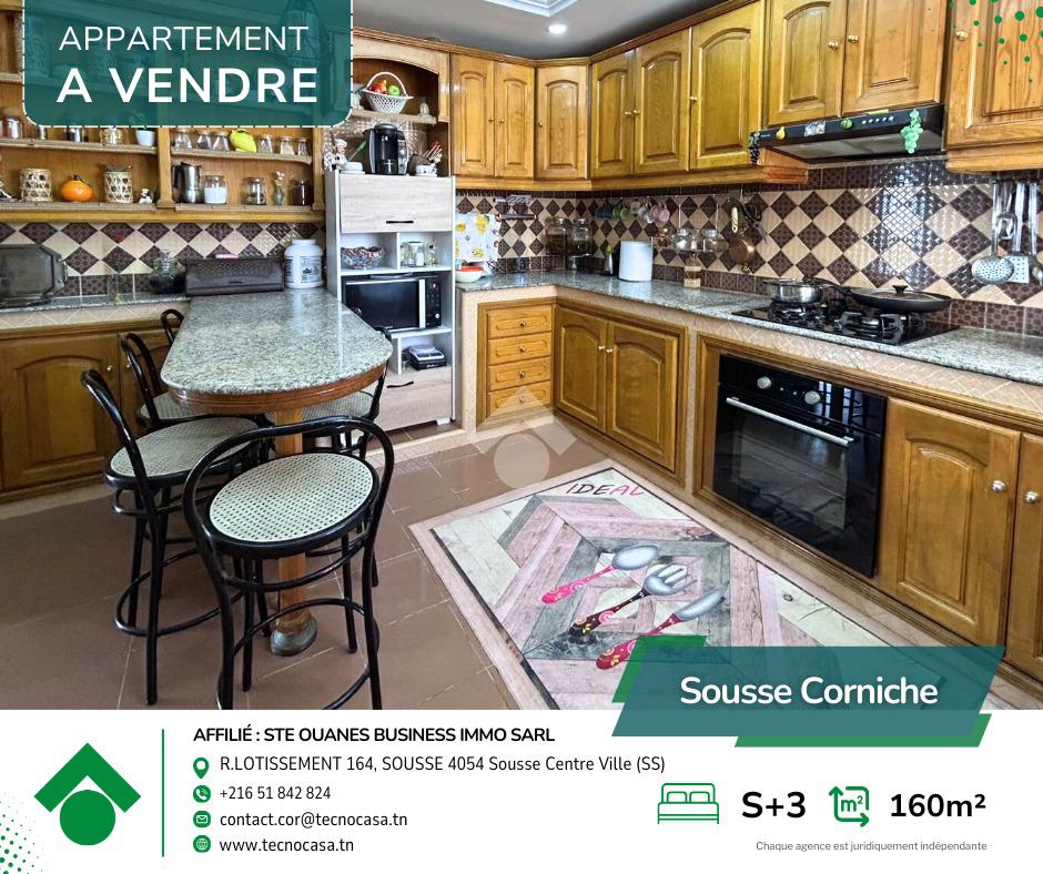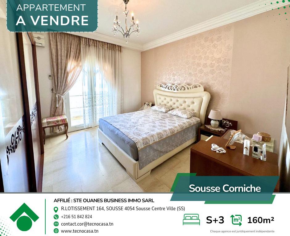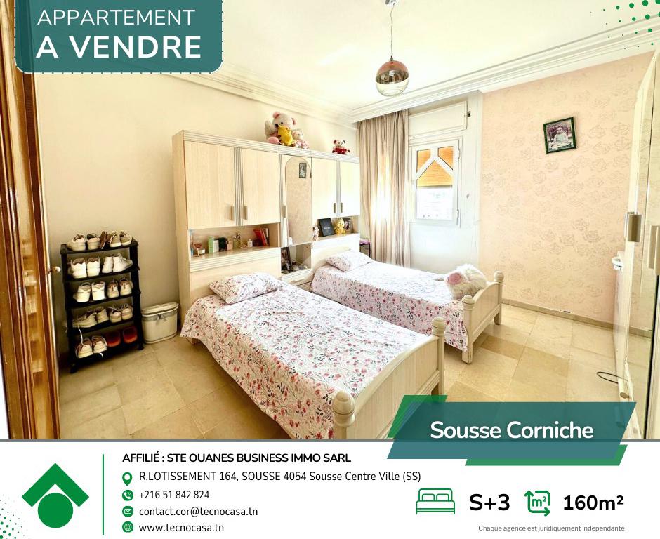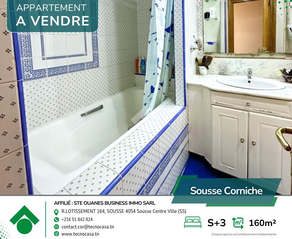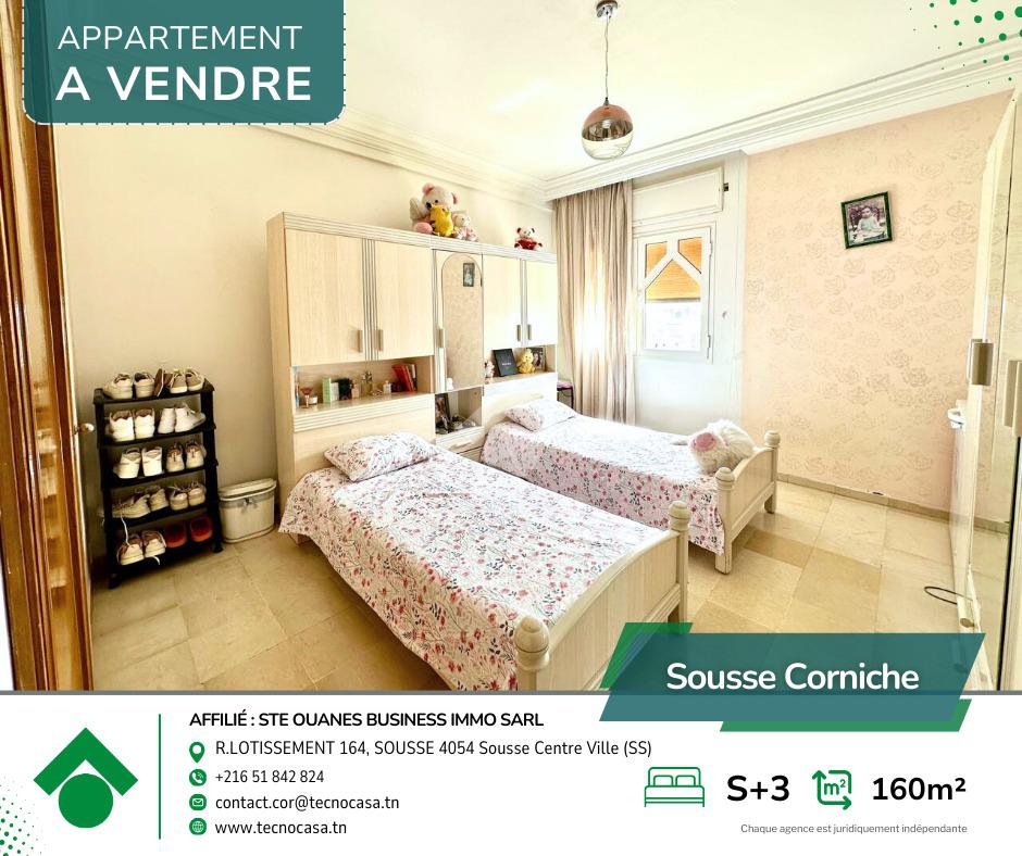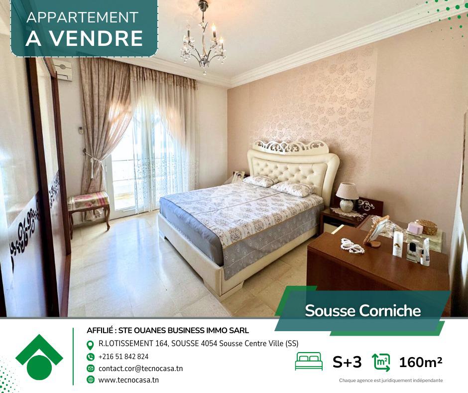 Situé au 7 étage d’une résidence sécurisée avec ascenseur, cet appartement S+3 bénéficie d’un emplacement privilégié en deuxième position de la plage, en plein cœur de la Corniche.